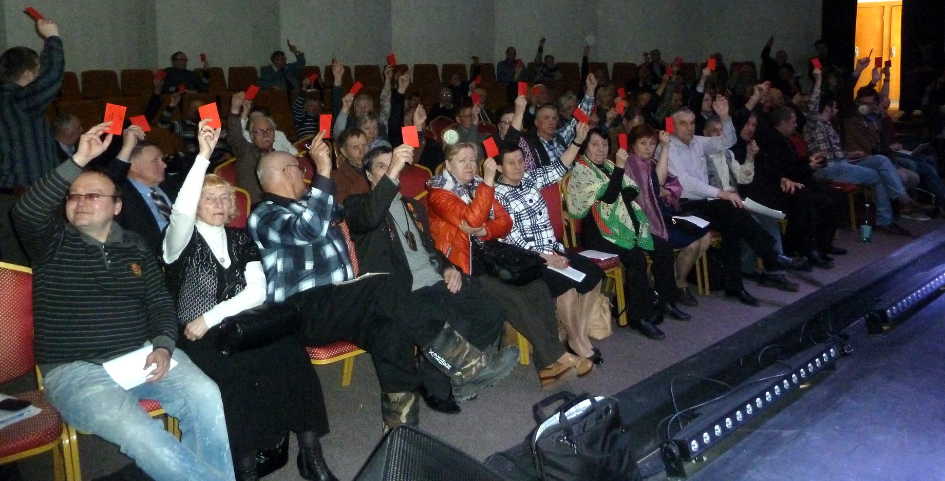 Съезд завершился дружным исполнением партийного гимна – «Интернационал».