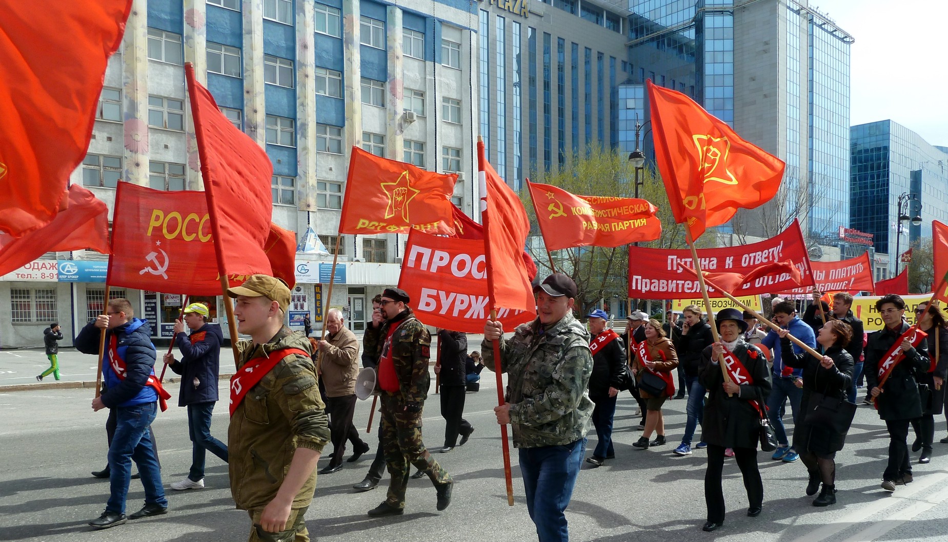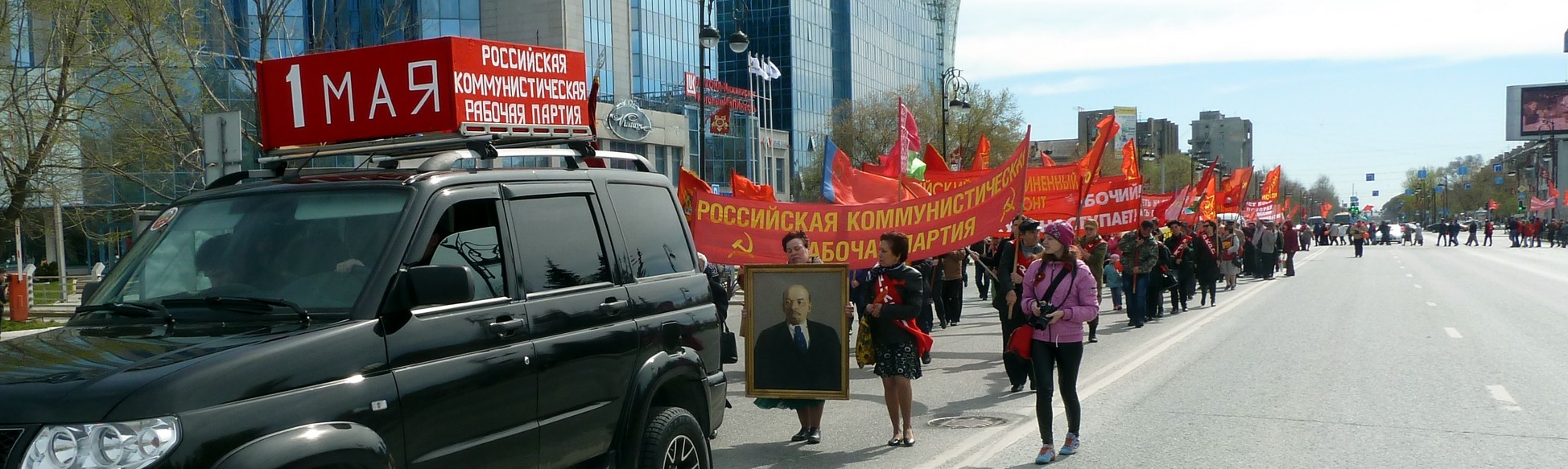 Автомобиль, идущий впереди колонны, украшен лозунгом: «Мир, труд, май». Оркестр играет замечательные советские мелодии. Люди несут красные флаги. На транспарантах антикапиталистические лозунги.
