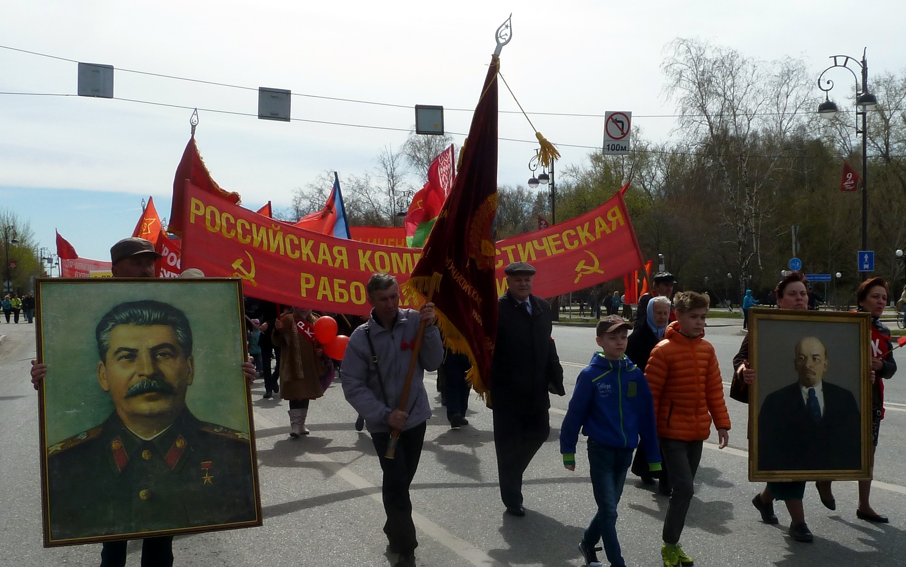 Молодежь в колонне традиционно в дружных кричалках провозглашает лозунги: «Рабочий, смелее гони буржуя в шею», «Наша Родина – СССР», «Социализм или смерть», «Россия без Путина» и множество других.