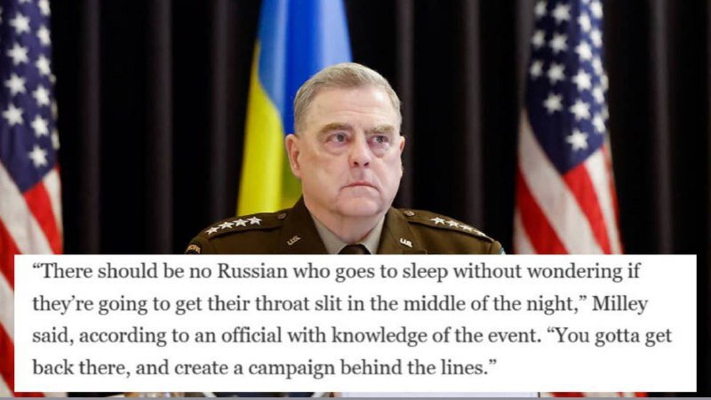 Генерал Армии США Марк Милли, председатель комитета начальников штабов ВС США (аналог нашего Генерального штаба) и реальный командующий украинскими бандеровскими отрядами в 2022 году перед “констрнаступлением” вооружённого сброда Украины (ВСУ) решил “придать мотивации” украинским боевикам, проходившим обучение в немецком Висбадене, такой материал опубликовали в The Washington Post.