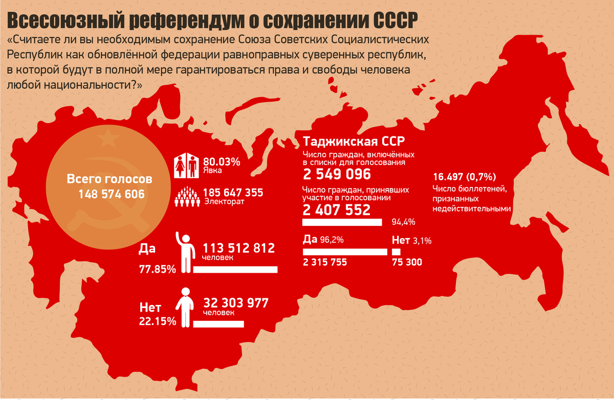 17 марта 1991 года состоялся Всесоюзный референдум, на который был вынесен вопрос: «Считаете ли Вы необходимым сохранение Союза Советских Социалистических Республик как обновлённой федерации равноправных суверенных республик, в которой будут в полной мере гарантироваться права и свободы человека любой национальности?». «За» сохранение СССР проголосовало 77,85 % от числа принявших участие в референдуме.. Такое проявление гражданственности Верховный Совет СССР оценил как акт мужества и патриотизма.