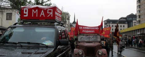 Те, кто шел в краснознаменной колонне РКРП-КПСС и РОТ ФРОНТа, держали транспаранты «Слава советскому народу – победителю фашизма!», «За Советскую Родину!», «Да здравствует Сталин – вдохновитель и организатор Великой Победы!», «Слава Советскому народу – победителю фашизма!» и т.д.. В колонне дружно стоят ветераны, рабочие, молодежь…