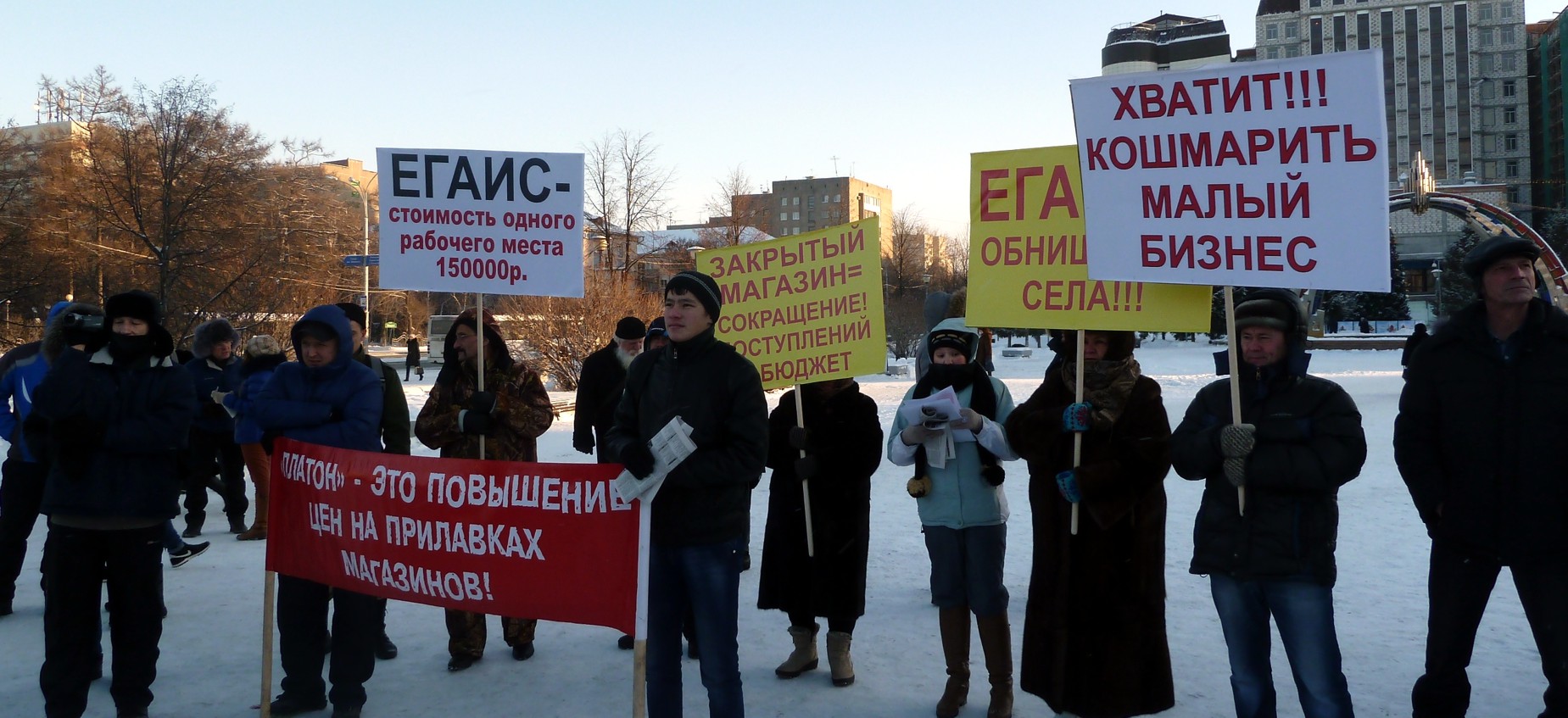 Кроме того, на митинге выступило много частных предпринимателей. Государство и им сделало «подарок», введя систему ЕГАИС – Единая государственная автоматизированная информационная система, предназначенная для государственного контроля за объемом производства и оборотом этилового спирта, алкогольной и спиртосодержащей продукции. Тем самым частные предприниматели фактически лишаются возможности торговать алкогольной продукцией, т.к. производители и импортеры алкоголя должны отправлять сведения о производстве и обороте этилового спирта, алкогольной и спиртосодержащей продукции в Росалкогольрегулирование. Подключение к данной системе стоит около 150 тыс. руб., кроме того нужно будет платить ежемесячные налоги и составлять огромную отчетность, штрафы за ошибки в отчетности составят от 150 до 200 тысяч рублей. Это приведет к тому, что малым торговым точкам придется либо полностью отказаться от торговли самым ходовым товаром и в итоге разориться, либо существенно повысить цены и тем самым лишиться покупателей. Участники митинга говорили, что все эти меры делаются для того, чтобы вытеснить малый бизнес и полностью отдать его в руки крупных торговых сетей, большинством из которых владеют олигархи или родственники первых лиц государства.