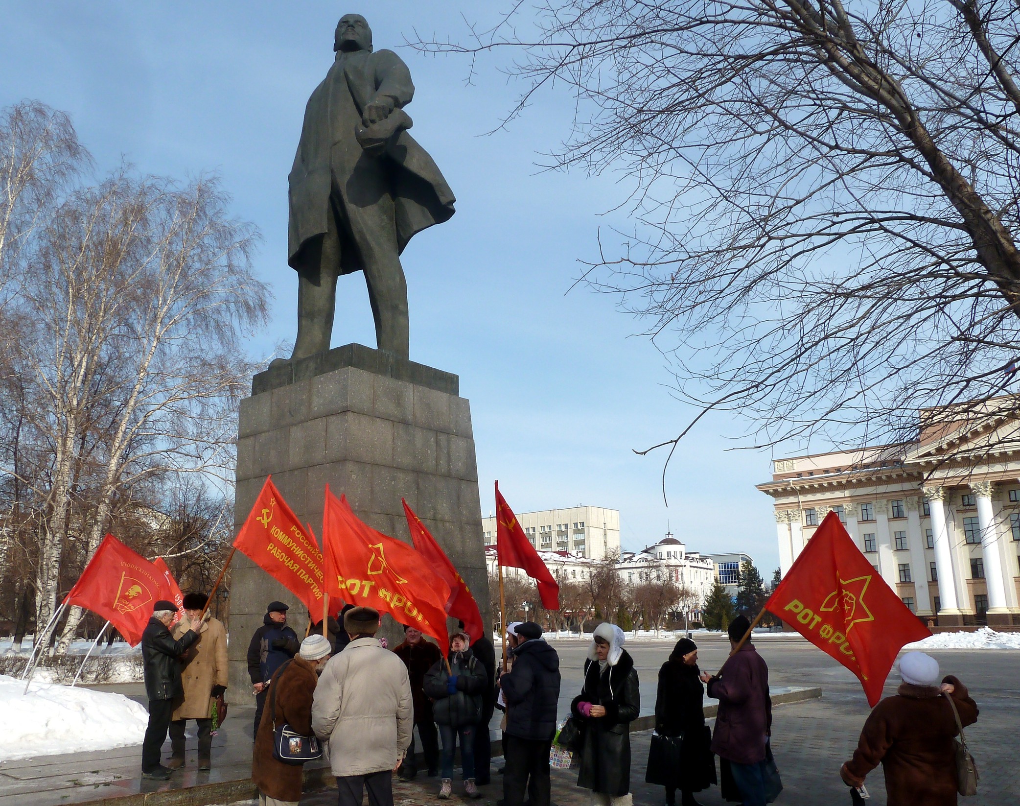 В солнечный, тёплый, почти весенний день 23 февраля коммунисты Тюмени вышли на Центральную площадь к памятнику В.И. Ленину на митинг, посвященный 99-й годовщине Рабоче-Крестьянской Красной Армии.