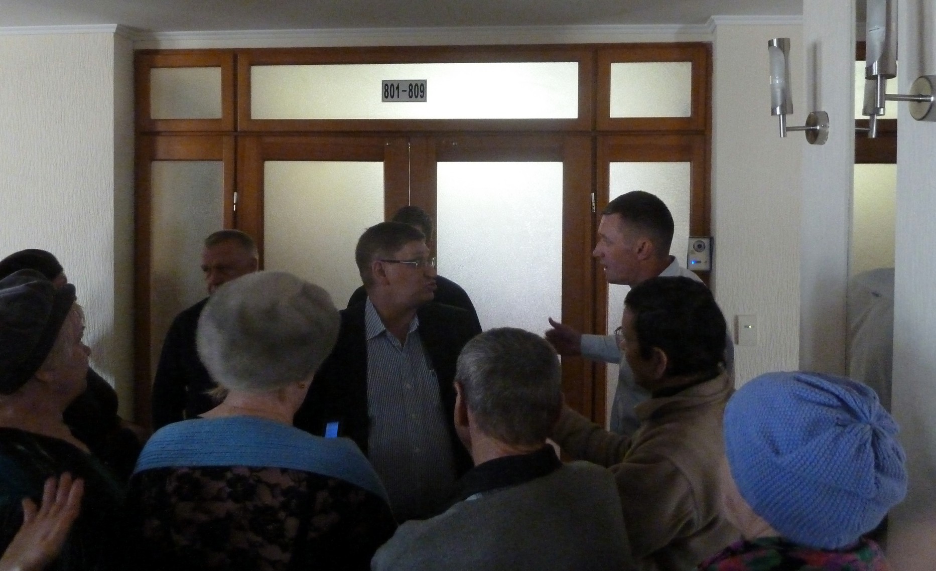 Проблемы начались уже на входе. Охрана, отгородившись турникетами и рамками металлоискателей, никого не хотела пускать. Но тут кто-то из выходящих открыл турникет и народ плавно потёк к лифтам. Там чиновниками была организована вторая линия обороны, но и её народ прорвал. И вот уже на восьмом этаже, буквально у порога кабинета «лучшего мэра России» чиновники встали насмерть. Особенно отличился начальник управления организационной работы Администрации г. Тюмени Новоселов А.А. И чего только пенсионеры не услышали от него в свой адрес: террористами называл, преступниками тоже и вообще высказывался крайне неуважительно. А на мужчин с кулаками начал бросаться. И такая ненависть была у него в глазах. Даже бравировал своим хамством, уверенный в своей полной безнаказанности. Так и не пустили к Моору.
