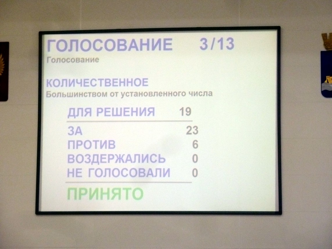 1. В итоге изменения в положение о местных налогах были приняты большинством голосов. За максимальную ставку имущественного налога проголосовали 26 депутатов, против шесть.