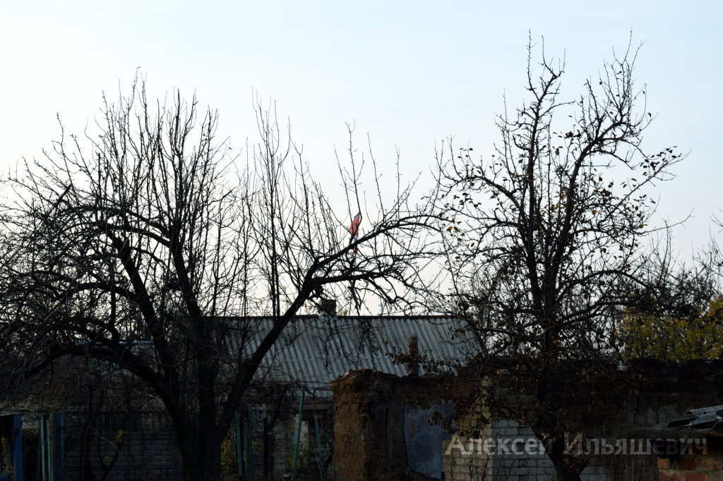По одну сторону дороги — дом, в котором отдыхают ополченцы. Здесь они обзавелись хозяйством, завели десяток кур. А за домом напротив уже начинаются окопы.