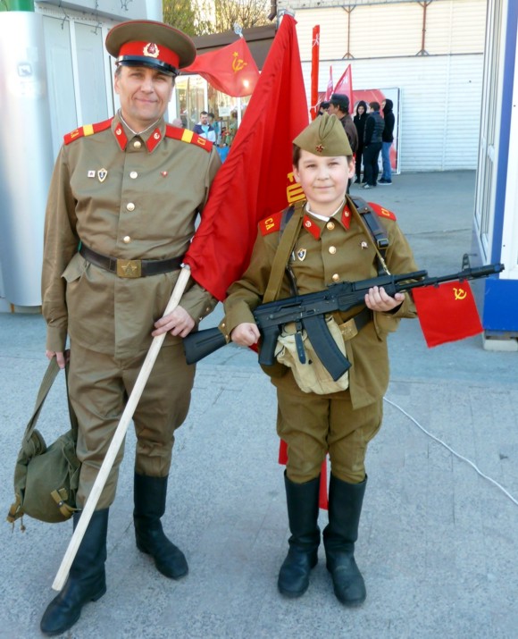 Сегодня наш день: звучат советские песни, масса парней и мужчин в форме солдат Великой Отечественной войны. Вот отец и сын, оба в солдатской форме с советским флагом.