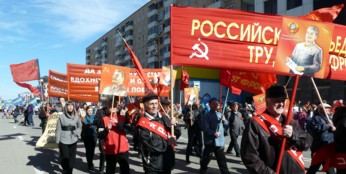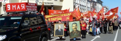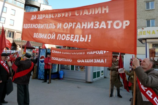 На транспарантах надписи: «Слава советскому народу – победителю фашизма», «Да здравствует Сталин – вдохновитель и организатор великой Победы», «Мирная социалистическая революция будет», «Антикоммунизм = фашизм».